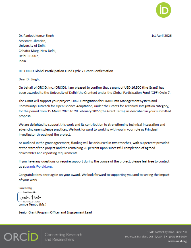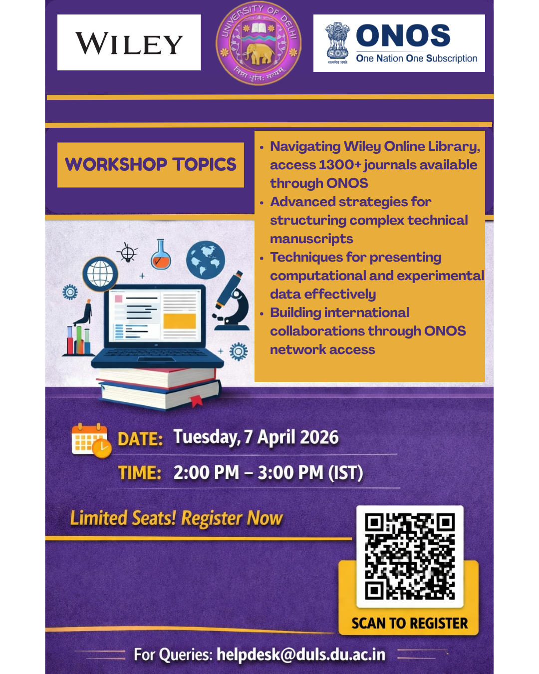 Established in the year 1922, the University Library shifted to its present locale in 1958 and developed into Delhi University Library System around 1974. Presently there are 34 libraries in its fold. DULS is accomplishing its task of reaching to wider academic community. It is one of the largest academic library systems of the country in terms of collections and services. The core DULS collection is computerized with the provision of a centralized Web OPAC facility to cater to the information needs across various disciplines. The system is actively involved in advanced web based information services and promotes the use of e-content in teaching, learning and research by conducting innovative Information Literacy Programs (ILP) focusing on e-resources, research metrics- Impact Factor, h-Index, academic integrity, etc. for the benefit of scholars at large. It is also making efforts in developing tutorials to make the community proficient in the use of online e-content.