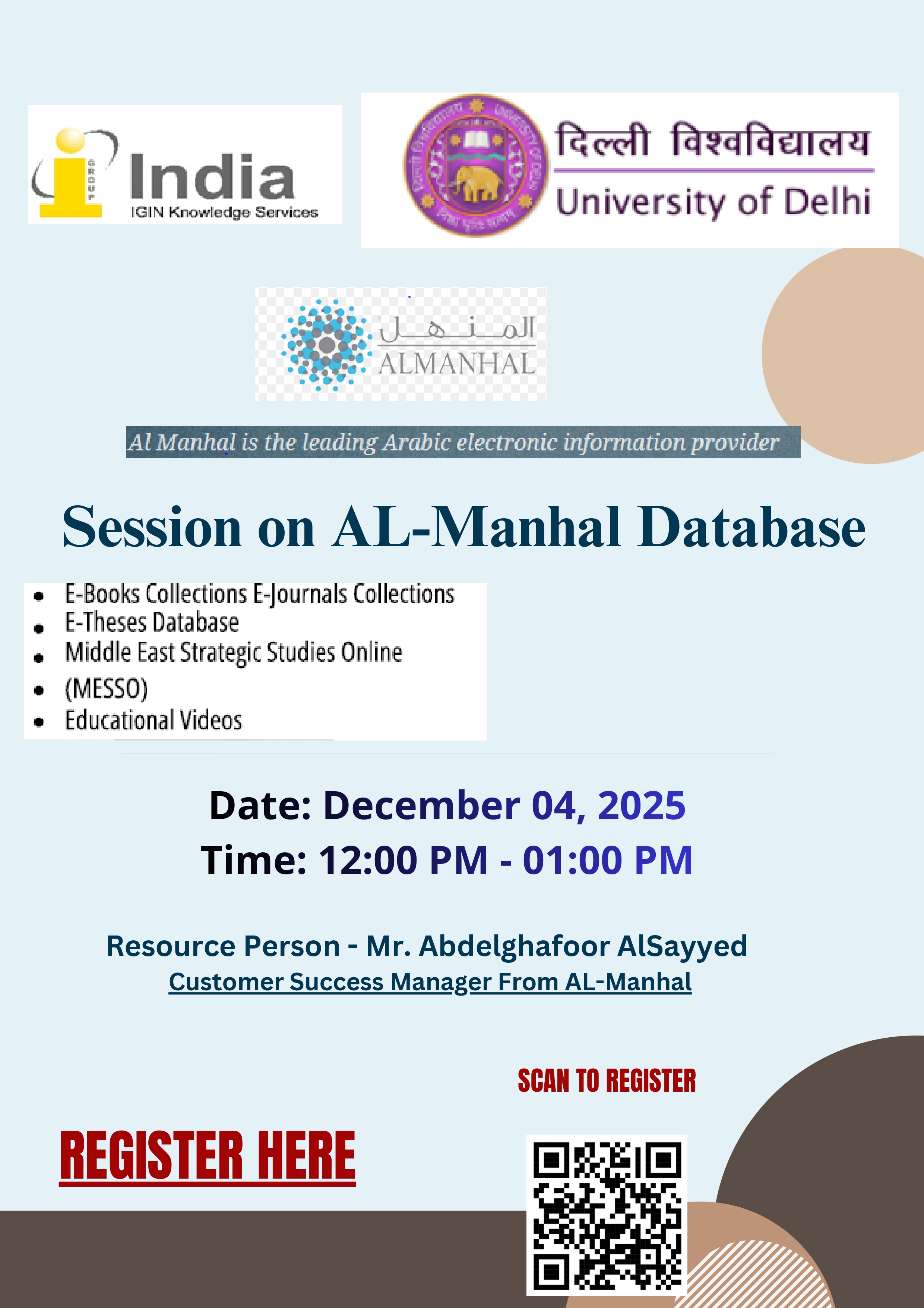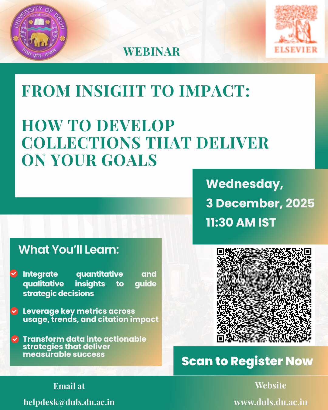 Established in the year 1922, the University Library shifted to its present locale in 1958 and developed into Delhi University Library System around 1974. Presently there are 34 libraries in its fold. DULS is accomplishing its task of reaching to wider academic community. It is one of the largest academic library systems of the country in terms of collections and services. The core DULS collection is computerized with the provision of a centralized Web OPAC facility to cater to the information needs across various disciplines. The system is actively involved in advanced web based information services and promotes the use of e-content in teaching, learning and research by conducting innovative Information Literacy Programs (ILP) focusing on e-resources, research metrics- Impact Factor, h-Index, academic integrity, etc. for the benefit of scholars at large. It is also making efforts in developing tutorials to make the community proficient in the use of online e-content.