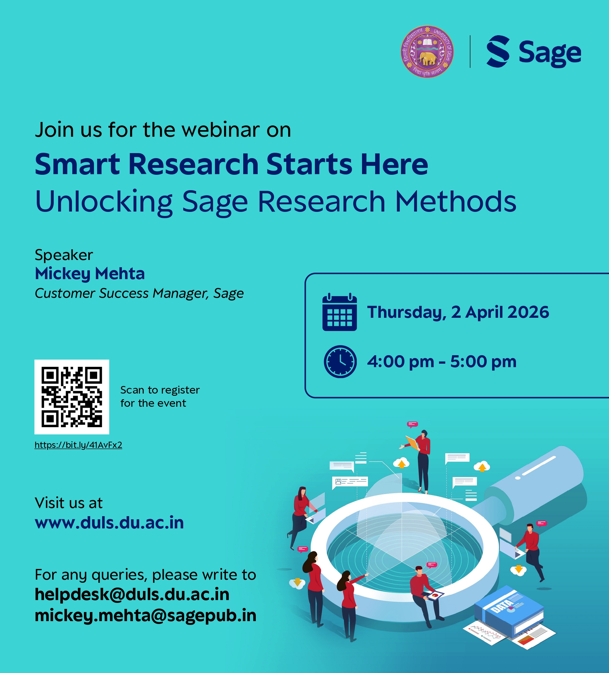 Established in the year 1922, the University Library shifted to its present locale in 1958 and developed into Delhi University Library System around 1974. Presently there are 34 libraries in its fold. DULS is accomplishing its task of reaching to wider academic community. It is one of the largest academic library systems of the country in terms of collections and services. The core DULS collection is computerized with the provision of a centralized Web OPAC facility to cater to the information needs across various disciplines. The system is actively involved in advanced web based information services and promotes the use of e-content in teaching, learning and research by conducting innovative Information Literacy Programs (ILP) focusing on e-resources, research metrics- Impact Factor, h-Index, academic integrity, etc. for the benefit of scholars at large. It is also making efforts in developing tutorials to make the community proficient in the use of online e-content.